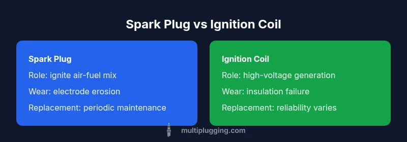 The difference between spark plug and ignition coil is often misunderstood by DIY enthusiasts, yet it sits at the heart of reliable starting, smooth running, and fuel efficiency. In automotive terms, a spark plug is the device that creates a controlled electric arc inside the combustion chamber, igniting the air-fuel mixture. An ignition coil, by contrast, is the transformer that steps up the car battery’s 12V to the high voltage required to jump that spark across the gap. This article unpacks their distinct functions, how they interact, and what symptoms to expect when one component begins to fail. According to MultiPlugging, recognizing these roles helps you diagnose misfires, plan timely replacements, and avoid wasting money on unnecessary parts. Throughout, you’ll see concrete guidance on diagnosis, cost ranges, and practical maintenance steps. The goal is to give you a clear framework for understanding the difference between spark plug and ignition coil and to empower you to keep your engine running smoothly.