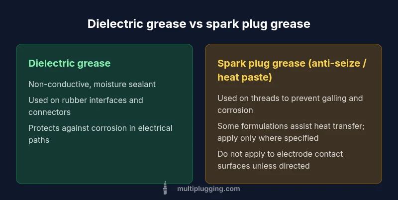 According to MultiPlugging, is spark plug grease the same as dielectric grease? No. Dielectric grease is silicone-based and non-conductive, used to seal moisture in electrical connections. Spark plug grease is not a universal product; it commonly refers to thread anti-seize or a heat-transfer compound used for specific steps. Do not apply dielectric grease to metal spark plug contact surfaces; use it on rubber boots or connectors per manufacturer guidance.