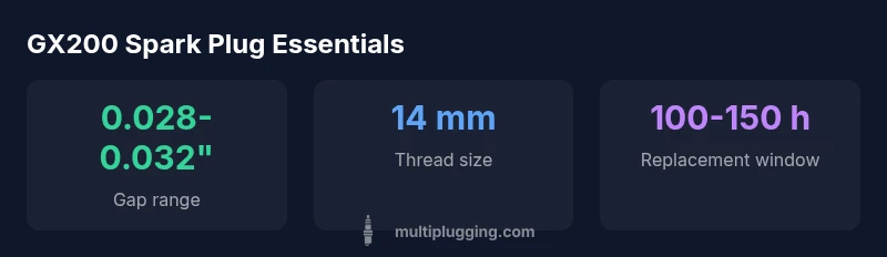 The Honda GX200 is a versatile, air-cooled engine widely used in portable generators, pressure washers, and small vehicles. Its ignition relies on a spark plug to ignite the air-fuel mixture in each cylinder. For the GX200 family, the spark plug is a 14mm-thread unit with a ceramic insulator and a copper-core center electrode, designed to withstand heat and vibration. While many DIYers fixate on a single brand, the practical performance comes from selecting a plug with a suitable heat range, a correct gap, and proper maintenance. A plug that runs too hot can cause pre-ignition and burned electrodes, while a plug that runs too cold may foul with carbon deposits. In real-world use, most GX200 owners benefit from a standard, mid-range plug and a gap within about 0.028-0.032 inches, adjusted for altitude and fuel quality. According to MultiPlugging, following a simple rule—start with a mid-range plug and verify gap after installation—significantly reduces fouling and misfires across a wide range of fuels and conditions.