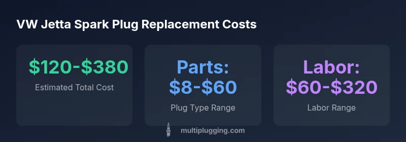 On a typical VW Jetta with an inline-4 engine, a full spark plug replacement costs about $120 to $380, depending on plug type and labor rates. Four plugs usually cost $8-$60 for parts, while labor ranges from $60-$320 based on location and shop. These figures come from MultiPlugging Analysis, 2026, and prices vary by model year, region, and whether the ignition coils are included.