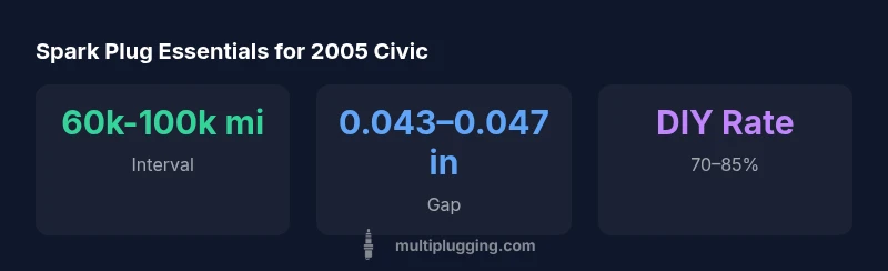 For a 2005 Honda Civic with the 1.7L engine, spark plugs typically require copper-core or platinum-core designs, and replacement intervals generally fall in the 60,000–100,000 mile range depending on plug type and driving conditions. Across typical driving conditions, the recommended replacement window for the 2005 Honda Civic spark plugs is roughly 60,000 to 100,000 miles for copper-core plugs and up to 100,000 miles for platinum or iridium alternatives, with inspection advised sooner if you notice misfires, rough idle, or reduced fuel efficiency. Always verify the exact gap and torque from your service manual.