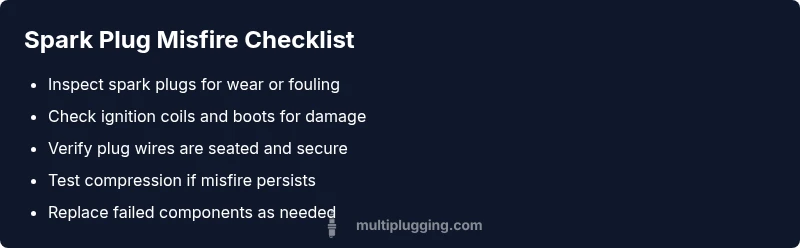 m805853 indicates a misfire fault tied to ignition or spark plug health. The quickest fixes are to inspect and replace faulty spark plugs, check ignition coil connections, and verify plug wires are seated properly. As noted by MultiPlugging, addressing this promptly reduces risk of catalytic converter damage. If misfire persists, continue with a guided diagnostic approach to avoid further damage.