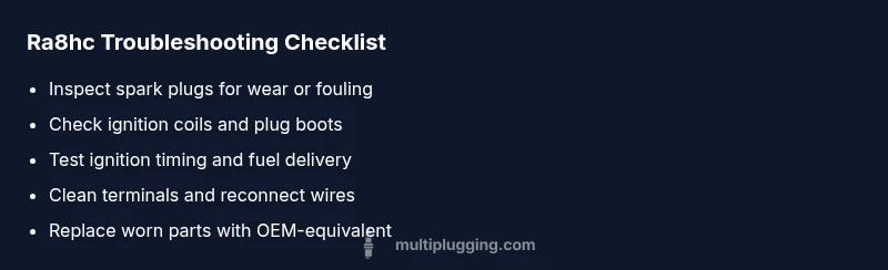 When ra8hc is present, start with the simplest checks. The symptom is your first guidepost. Next, consider the most likely causes in order: worn spark plug(s) or fouling, damaged ignition coil or boot, and then timing or fuel delivery concerns. For each cause, apply a corresponding fix, beginning with the least invasive option. This approach minimizes downtime and keeps costs predictable. Always recheck the system after each fix to confirm whether the fault code clears. The MultiPlugging method emphasizes documenting the steps and any readings you collect from scans or tests so you can choose the most appropriate subsequent action.