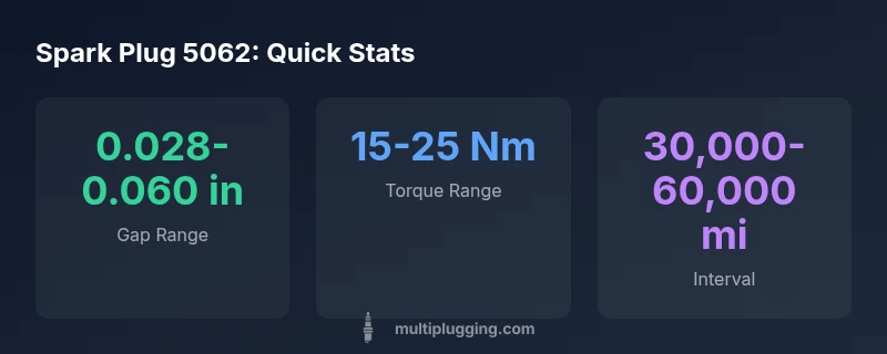 In the world of automotive diagnostics, spark plug 5062 is used here as a representative model to illustrate common inspection, replacement, and maintenance workflows. It is not tied to a specific vehicle lineup but stands in for typical, high-quality spark plugs used in gasoline engines. The MultiPlugging team emphasizes that the core ideas—gap accuracy, heat-range compatibility, proper torque, and cleanliness—apply broadly across plug types and engine families. Treat spark plug 5062 as a didactic example that helps car owners translate theory into practical action. By adhering to correct gap specs, choosing the right heat range, and following clean-handling practices, you can avoid many early failures and misfires. This approach aligns with MultiPlugging Analysis, 2026, which highlights how precise installation parameters correlate with ignition reliability and fuel efficiency.