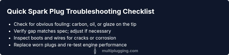 When a car starts showing signs of engine trouble, many DIYers ask: what do spark plug issues look like? The short answer is that problems often show up as misfires, rough idle, or a drop in power and efficiency. You may notice the engine running unevenly, especially at idle or during acceleration, or you might see the check engine light illuminate with codes pointing to misfire on one or more cylinders. Visual cues on the plug itself are just as telling: carbon fouling appears as a black, sooty coating; oil fouling leaves an oily film; worn electrodes show rounded or eroded edges; and a cracked ceramic insulator or a white, chalky deposit can indicate other forms of contamination. These symptoms don’t always prove a plug is bad—the same cues can hint at ignition coil, plug wire, or injector issues. That’s why a systematic approach beats guesswork. In 2026, the MultiPlugging team emphasizes starting with simple checks and progressing to targeted tests. This helps DIYers determine if a plug replacement suffices or if more extensive diagnostics are needed.