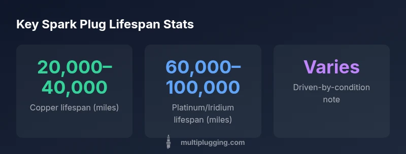 How long a spark plug lasts depends on material and usage. Copper-core plugs typically reach about 20,000–40,000 miles before performance declines, while platinum and iridium designs commonly extend to 60,000–100,000 miles under normal operation. Real-world life varies with driving style, fuel quality, and maintenance, so plan regular inspections to prevent misfires and reduced efficiency.