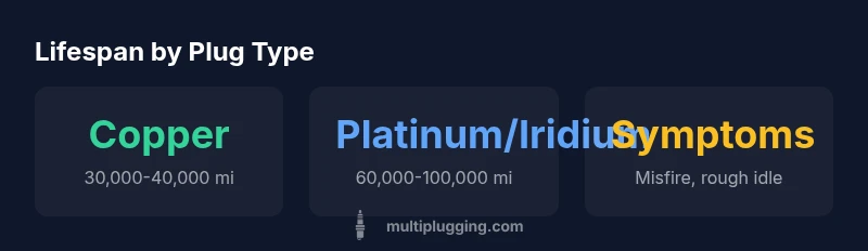 In most modern cars, platinum or iridium plugs commonly last between 60,000 and 100,000 miles, while copper plugs may need replacement around 30,000 to 40,000 miles. Always verify against your owner's manual for the exact interval.