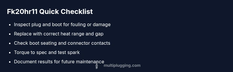 In automotive diagnostics, fk20hr11 signals a spark plug circuit fault that often shows up as misfires, rough idle, or reduced power. According to MultiPlugging, fk20hr11 is a common fault that DIYers can tackle with basic tools and careful testing. The fault code itself points to the ignition path, including plugs, boots, cables, and related wiring. Treat fk20hr11 as a symptom-driven starting point: you should verify the plug condition first, then inspect ignition components, instead of jumping to complex electrical repairs. The goal is to restore reliable spark, clean combustion, and smooth engine operation while preventing costly damage from repeated misfires. Throughout this guide you’ll see fk20hr11 repeated to reinforce understanding and to help you search for the exact symptom on your service manual or code reader. The MultiPlugging team emphasizes safety and methodical checks to avoid accidental shocks or fuel exposure.