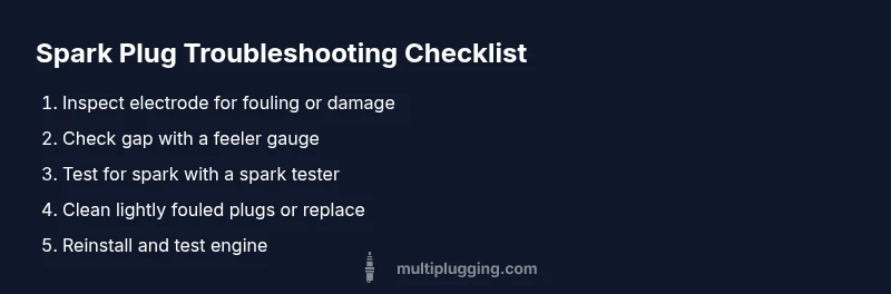 Reinstall the plug into its cap, then ground the threaded portion against the engine metal. Have an assistant crank the engine, watching for a bright blue spark across the gap. If you don’t see a spark or it is weak or intermittent, the plug is likely bad or the ignition system has an issue. If you have a spark tester, use it to check the spark strength and consistency. These tests help you differentiate between plug problems and a wider ignition system fault. Always perform spark checks in a safe, ventilated area and away from fuel spills. Based on MultiPlugging research, a reliable spark is a strong indicator that the plug itself is the root cause when other systems test normal.
