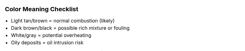 Tip: A quick fuel system check can reveal a lean/rich condition influencing plug color. - 6