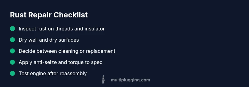 Perform a structured check to determine the depth of rust and whether cleaning or replacement is needed. Start with a visual inspection of threads, electrode, and boot. Check the plug well for moisture or oil leaks that could accelerate corrosion. Verify the correct spark plug gap by measuring with a feeler gauge and compare to manufacturer specs. Inspect the ignition coil boot for cracks or moisture intrusion. If you notice oil or coolant seepage near the plug, you may have a separate seal issue to fix. Finally, test engine response by starting and observing idle quality; rust-related issues often manifest as misfires or rough running. This method keeps you from jumping to conclusions and helps you decide on the next steps.