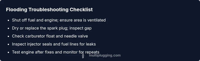 Common causes of fuel flooding and how to spot them\n\nThe most frequent culprits are a stuck carburetor float/needle valve, a faulty choke setting, or an injector that stays open too long. In carbureted engines, a float fault can flood the intake with raw fuel, while in fuel-injected systems a leaky injector or a failed fuel-pressure regulator can do the same. Excessive cranking without a fuel pump priming can also flood a cylinder, especially after a long cranking attempt on a cold engine. Look for signs such as a strong gasoline smell, visible fuel leaks, or wetness around the spark plug boot and cylinder head.\n