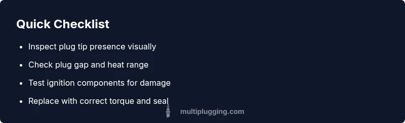 (Internal reference: Diagnostic flow is summarized below, with steps you can take in sequence. See the dedicated diagnosticFlow block for structured data.) A missing tip is a strong cue that the plug has failed mechanically rather than just fouled. Cross-check the ignition coil, plug boot, and wiring for heat damage or arcing. If compression tests are normal, the issue is most likely the plug itself or its immediate circuit. If compression is low, there may be a deeper engine problem. In all cases, replacement of the plug is recommended when the tip is missing, and related components should be inspected.
