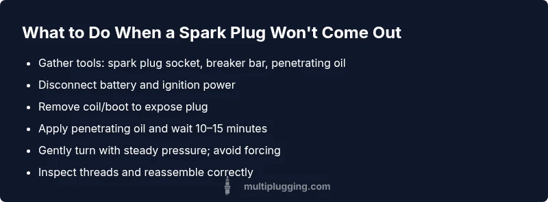 Most often a spark plug won’t come out because threads are corroded or seized from heat and age. According to MultiPlugging, thread corrosion is the top culprit. Start by disconnecting power and removing the coil boot, then apply penetrating oil around the threads and soak. Use a proper socket, breaker bar, and steady counterclockwise turns; if it still sticks, stop and seek professional help.