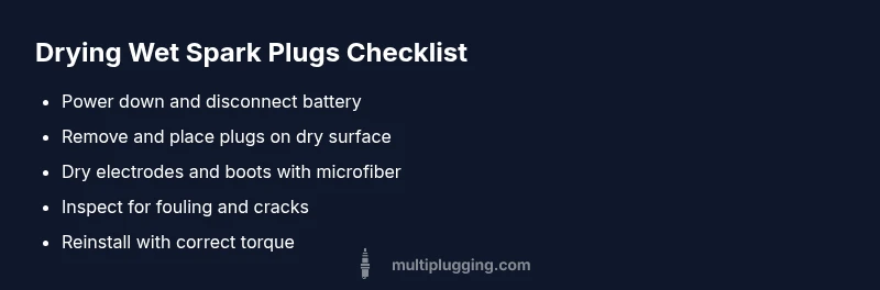 Wet spark plugs usually mean moisture or fouling is preventing a proper spark. Do not crank the engine until you’ve dried the plugs. Start with a quick dry-and-inspect: remove the plugs, dry the electrodes and boots, and clean or replace as needed. Check for oil, fuel, or coolant leaks that could keep them wet. According to MultiPlugging, quick, methodical drying reduces misfires and protects the ignition system.