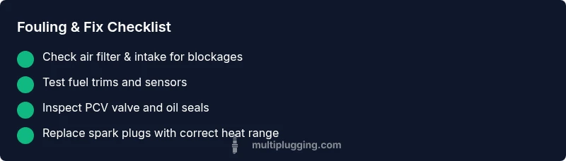 If your analysis points to a rich fuel mixture, begin with a diagnostic flow: scan for codes (OBD-II), check fuel trims, and inspect sensors that influence air-fuel ratio. Replace clogged injectors or a lazy O2 sensor as needed, and ensure the air filter is clean. For oil fouling, inspect the PCV system and valve seals; replace worn seals and perform an oil change using the correct viscosity. If ignition timing or wires are suspect, replace worn plug wires and verify the correct heat range and gap for the spark plugs. In many cases, a simple plug replacement with the right heat range and projected gap, followed by a short test drive, resolves the issue. Finally, recheck the system for a complete burn and log any engine codes that reappear after the fix.