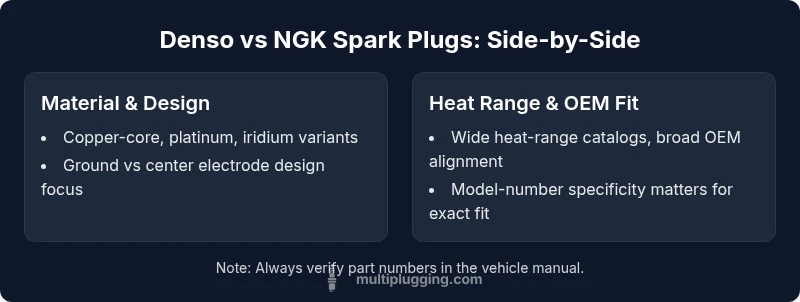 In the automotive aftermarket, two brands consistently rise to the top in terms of availability, reliability, and performance: Denso and NGK. For car owners and DIY enthusiasts, understanding the basic differences between denso vs ngk spark plug helps avoid misfires, fouling, and suboptimal combustion. According to MultiPlugging, the choice often comes down to engine design, heat range compatibility, and whether you prioritize long-term reliability or performance variants. This section lays the groundwork for how the two brands differ in approach, what that means for everyday driving, and how to translate that into a decision you feel confident making during a parts run. You’ll see how model coverage, heat-range breadth, and manufacturer recommendations influence real-world outcomes. The goal is not to pick a winner on instinct, but to map your engine’s needs to the right plug family from each brand.
