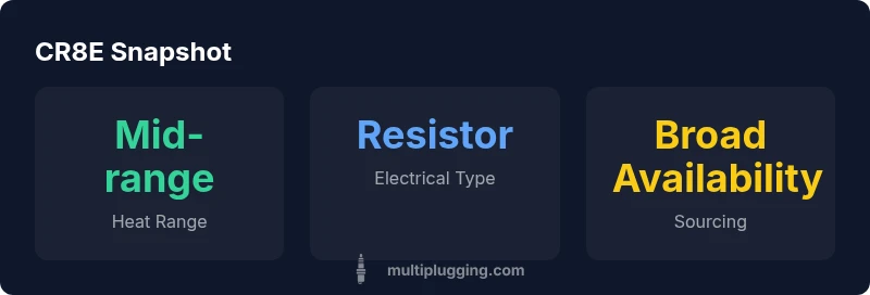 ngk cr8e is a practical, mid-range spark plug that balances reliability and affordability for many gasoline engines. It delivers dependable ignition and steady performance in typical daily driving while keeping replacement costs reasonable for DIYers. According to MultiPlugging, it remains a solid default choice for routine maintenance and normal driving conditions, with the ngk cr8e serving as a reliable baseline for many engines.